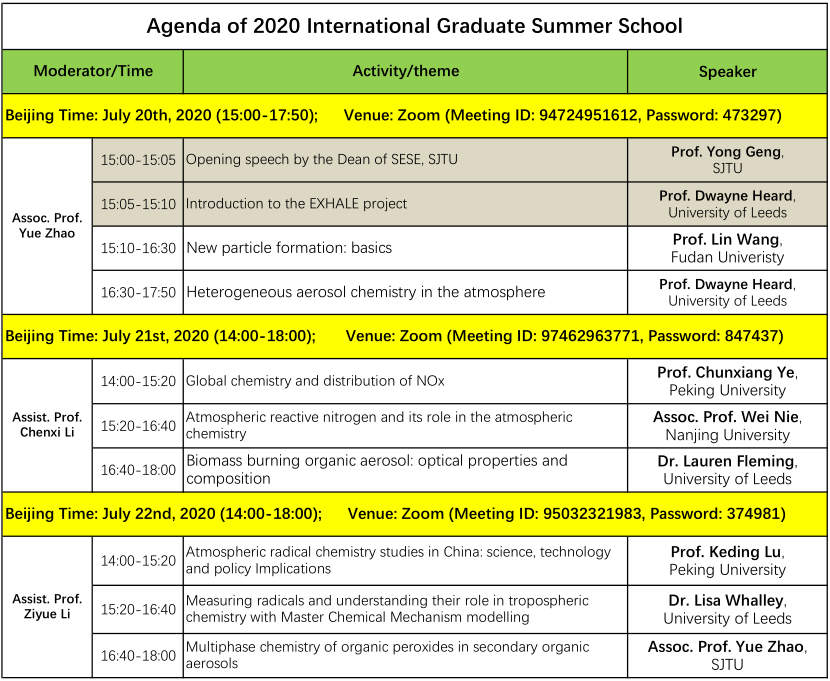 The 2020 International Graduate Summer School on Atmospheric Environmental Sciences will be jointly organized by the School of Environmental Science and Engineering of Shanghai Jiao Tong University and the School of Chemistry and School of Earth and Environment at the University of Leeds. The summer school offers a valuable opportunity for graduate students to expand their knowledge and deepen their understanding of atmospheric environmental sciences, especially fundamental air pollution chemistry, aerosol-planetary boundary layer interactions, air quality modeling, and the health and economic impacts of air pollution.