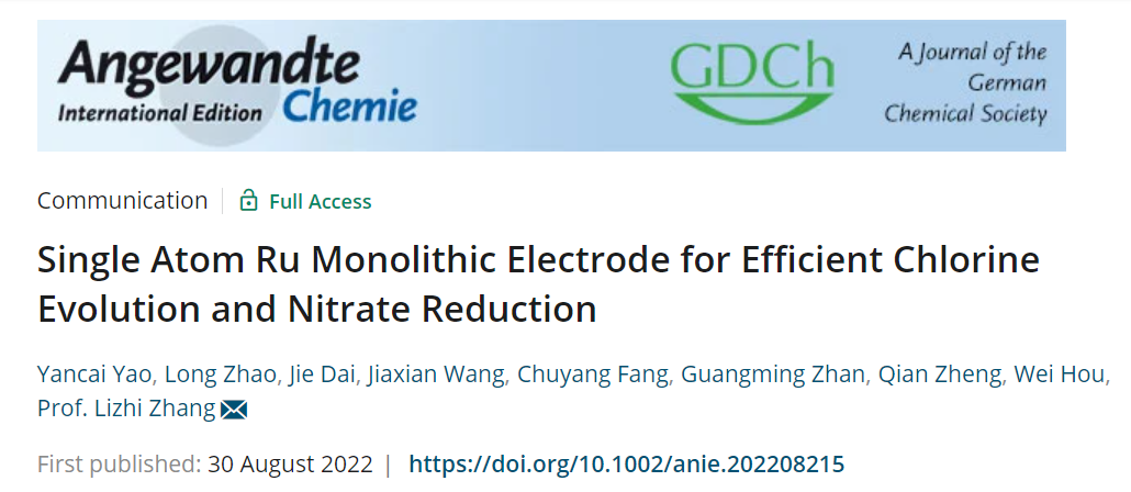 近日,Beat365官方网站张礼知教授团队在Angew. Chem.在线发表了研究论文Single Atom Ru Monolithic Electrode for Efficient Chlorine Evolution and Nitrate Reduction,Beat365官方网站长聘教轨助理教授么艳彩为该论文第一作者,特聘教授张礼知为通讯作者。