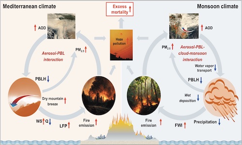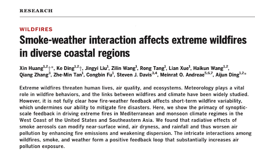 1.   Huang X, Ding K, Liu J, Wang Z, Tang R, Xue L, Wang H, Zhang Q, Tan Z-M, Fu C, Davis S J, Andreae MO, Ding A, Smoke-weather interaction affects extreme wildfires in diverse coastal regions, Science, 379, 6631, 457-461, https://doi.org/10.1126/science.add9843, 2023.