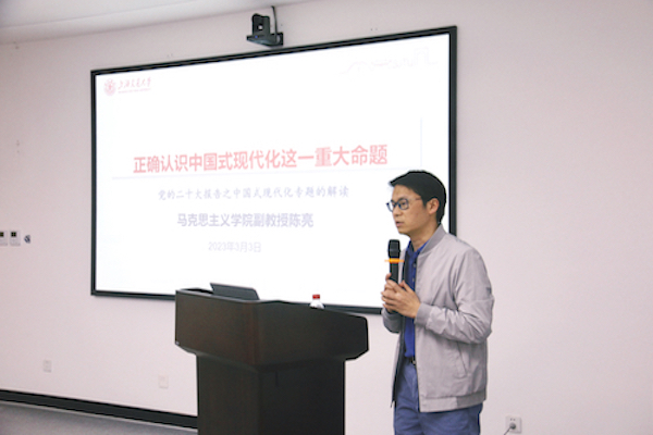 3月3日下午,Beat365官方网站举办中国式现代化专题党课,特邀马克思主义学院陈亮副教授作题为“正确认识中国式现代化这一重大命题—党的二十大报告之中国式现代化专题的解读”专题讲座。学院党委中心组全体成员、师生党支部书记、支部委员、团学骨干等参加学习,党委书记胡薇薇主持会议。