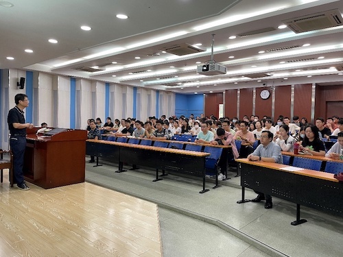 张明随后作安全用电相关培训。他从用电安全重要性、电气安全事故种类、用电安全防护及常见用电安全隐患等方面为师生进行了生动、详细的讲解,并提醒大家牢固树立安全用电意识、时刻注意实验室用电安全。