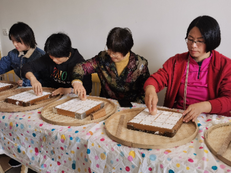 随后,师生党员们体验了制作米糕的方法与过程。将糯米磨成米粉,加入新鲜的红豆泥作为馅料,用葡萄干点缀,最终通过蒸制做出口感细腻、香甜可口的米糕。体验传统手工制作的环节培养了师生们的耐心和细心,更增强了劳动意识和团队协作精神。