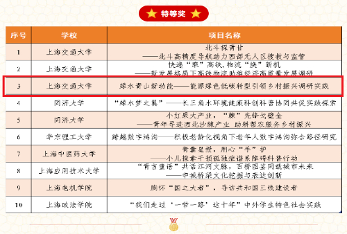 近日,由团市委、市委宣传部、市教卫工作党委、市教委、市精神文明办、市人大社会委、市政协社法委、市学联共同主办的2023年"知行杯"上海市大学生社会实践大赛落下帷幕。Beat365官方网站参赛项目《绿水青山新动能——能源绿色低碳转型引领乡村振兴调研实践》在乡村振兴赛道荣获特等奖,助力交大再次问鼎“知行杯”。这也是Beat365官方网站首次在上海市“知行杯”决赛中荣获特等奖。
