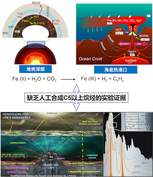 石油的主要成分是各种长链烷烃的混合物,其成油机理有生物成油和非生物成油两种学说。生物成因学说较被广为接受,认为石油是古代海洋或湖泊中的生物经过漫长的演化形成,不可再生。非生物成因学说认为石油是由地壳内本身的碳物种生成,可再生且与生物无关,即在地壳或地幔富含氢气的碱性水热流体蛇纹化过程中,碳物种在矿物催化剂的催化作用下加氢生成各种烃类化合物。然而,该学说一直缺乏实验证据,且水热环境如何促进碳链增长亦未知,导致非生物成因学说难于被广泛接受。