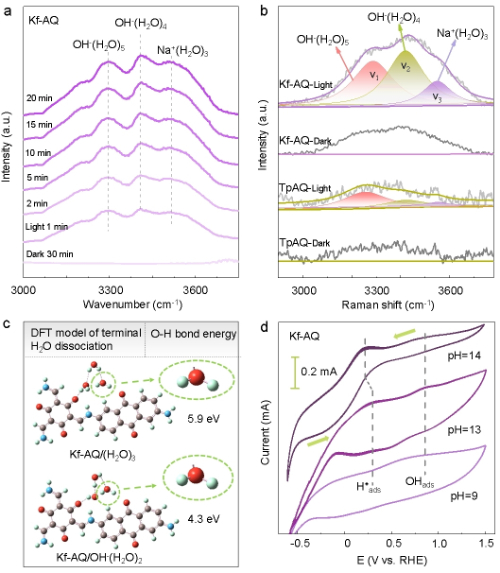 在可见光照射下,Kf-AQ表面产生电子-空穴对,其中电子通过C-N桥转移电子受体蒽醌基团AQ),而空穴则转移到酮基结构,实现电子空穴空间分离。酮吸附的团簇OH-(H2O)n被空穴氧化释放质子,并进一步被AQ上的电子还原形成活性氢H*ads),H*ads将蒽醌转化为氢醌,后者与氧气结合生成H2O2