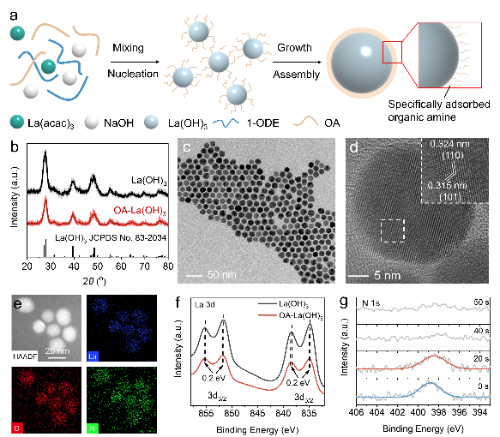 乙酰丙酮镧在油胺表面活性剂和十八烯溶剂中加热反应,经过连续还原、成核、生长为表面有机胺修饰氢氧化镧纳米晶。其中,油胺作为一种长链有机胺会特异性包裹在La(OH)3纳米晶表面,避免纳米晶团聚,有利于合成小尺寸La(OH)3纳米颗粒。TEM表明制备的OA-La(OH)3的平均粒径为17.2 ± 2.1 nm。红外光谱、La 3d XPS和刻蚀XPS数据证明了La(OH)3纳米晶表面被有机胺薄层包覆。