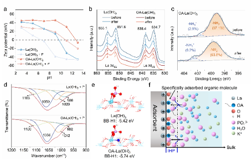 N 1s XPS表明OA-La(OH)3表面的氨基在水溶液中易于质子化为NH3+,同时以磷酸根(H2PO4-HPO42-)作为拉曼探测pH的信号分子,证明了OA-La(OH)3表面的微碱性环境和氨基在水溶液中质子化。Zeta电位结果也表明OA-La(OH)3含有更高的等电点和更多的正电荷。该电正性的OA-La(OH)3有利于定向富集低浓度电负性磷酸根离子,加速磷酸根离子向吸附剂表面迁移和固定,打破低浓度磷酸根传质壁垒。