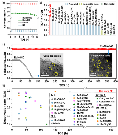 Ru-N-In/NC 催化剂的初始转化效率和选择性均超过99%,其TOF值也超过同类型的Ru基催化剂,而且还高于部分Au基催化剂,并且Ru-N-In/NC 的合成策略也适用于其他贵金属。长期稳定性评估结果显示Ru-N-In/NC可以保持超过600小时的稳定催化作用,显著优于最近报道的其他Ru基催化系统。