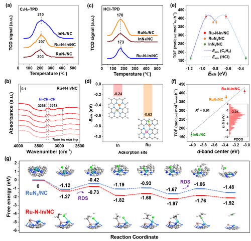 TPD,DRIFTS和DFT计算共同揭示具有适当间距的二聚体Ru-In几何结构可以缓解RuN4/NC上严重的位阻效应,Ru和In原子之间强烈的d-p相互作用导致Ru的d带中心上移到费米能级,从而使C2H2和HCl以适当的吸附强度分别吸附在In和Ru位点上。In原子的合作通过调节活性位点的电子构型,改变了乙炔加氢氯化的反应控速步骤,跳过了传统的*Cl加成的能垒限制,使反应在Ru-N-In/NC上以较低的自由能进行。