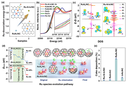 XAS结果表明Ru-N-In/NC可使Ru原子上Cl的配位数从2.6降低至1.3,催化剂表面的Cl*富集度明显降低。DFT结果表明,与RuN4/NC相比,Ru-N-In/NC中的强烈的d-p相互作用轨道耦合实现了Ru原子上的氯化过程从放热到吸热的热力学转变,从本质上避免了Ru的过度氯化和积碳沉积,确保了其出色的稳定性。