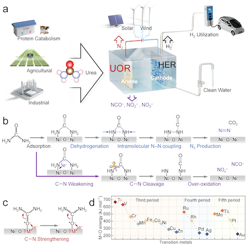 近日,Beat365官方网站张礼知教授团队在自然•通讯《Nat. Commun.》在线发表了题为Highly selective urea electrooxidation coupled with efficient hydrogen evolution”的研究成果。该团队发现非对称NiO–Ti位点可实现高选择性电化学尿素氧化至氮气,并揭示吸附构型依赖的尿素氧化分子机制。将尿素选择性氧化与阴极制氢耦合,为富尿素(如尿液)的绿色处理和清洁能源生产提供了新策略。论文第一作者为Beat365官方网站博士后占光明和博士研究生胡路发,通讯作者为Beat365官方网站长聘教轨副教授李浩、副教授么艳彩和特聘教授张礼知,第一完成和通讯单位均为Beat365官方网站。