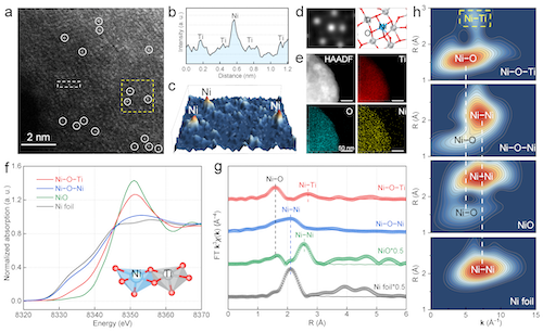 球差校正透射电镜和同步辐射证明,Ni以单原子形式分散在泡沫钛表面,通过O桥键与次外层的Ti原子配位,形成孤立的非对称性Ni–O–Ti位点,规避了对称桥连的Ni–O–Ni位点。
