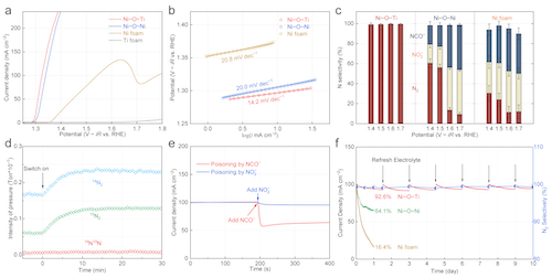 非对称性Ni–O–Ti位点在1.30 VRHE电位下即可实现10 mA cm2尿素氧化电流密度。更重要的是,该电极尿素氧化的N2选择性高达99%,几乎不产生氰酸盐和(亚)硝酸盐有害产物,在长达10天的运行过程中始终保持出色的尿素氧化活性和N2选择性。15N同位素的尿素氧化实验表明,生成的N2来自单个尿素分子内的NN偶联。