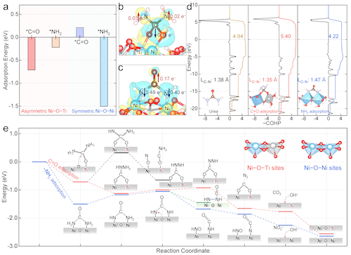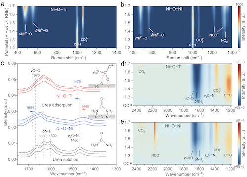 原位电化学拉曼光谱和傅里叶变换红外光谱证明,与传统的氮端尿素吸附构型不同,非对称Ni–O–Ti中的强亲氧Ti位点以氧端构型吸附尿素、向尿素分子的CN键注入电子,导致CN键红外振动蓝移,从而强化、稳定了CN键,提高了尿素氧化至N2的选择性。