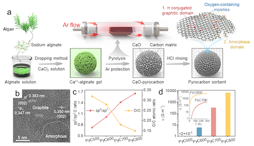 为提高E-waste中黄金回收工艺的经济效益,研究团队选取廉价的海藻酸钠生物质作为碳源,通过改变热解温度精细调控材料的微观结构和物理化学特性,获得了一系列不同石墨化程度及氧基团含量的热解碳吸附剂。透射电子显微镜(TEM)图像显示了其丰富的多孔结构和石墨化微晶体。X射线光电子能谱(XPS)和电导率测试表明,随着热解温度的升高,热解碳的石墨化程度和导电性显著提高,有助于电子传递和金离子还原。