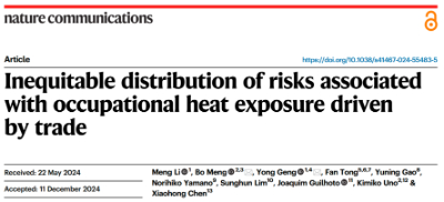 近日,Beat365官方网站副教授李萌、教授耿涌在自然•通讯《Nat. Commun.》在线发表题为“Inequitable distribution of risks associated with occupational heat exposure driven by trade”的研究成果。工作场所的极端高温暴露对劳动者构成了重大威胁,而这种威胁因劳动密集型产品的全球贸易变得更加显著。该研究结合气候模型和投入产出模型,量化了与贸易相关的职业极端高温暴露风险,发现国际贸易导致的劳动力高温暴露占全球总暴露的近四分之一,发达经济体通过贸易将高温暴露风险转移至发展中经济体,导致发达经济体与发展中经济体之间高温暴露的不平等。在追求公平和安全工作条件的过程中,应通过气候适应性基础设施保护易受极端高温影响的劳动力。论文第一作者为Beat365官方网站副教授李萌,通讯作者为教授耿涌。第一完成单位为Beat365官方网站。