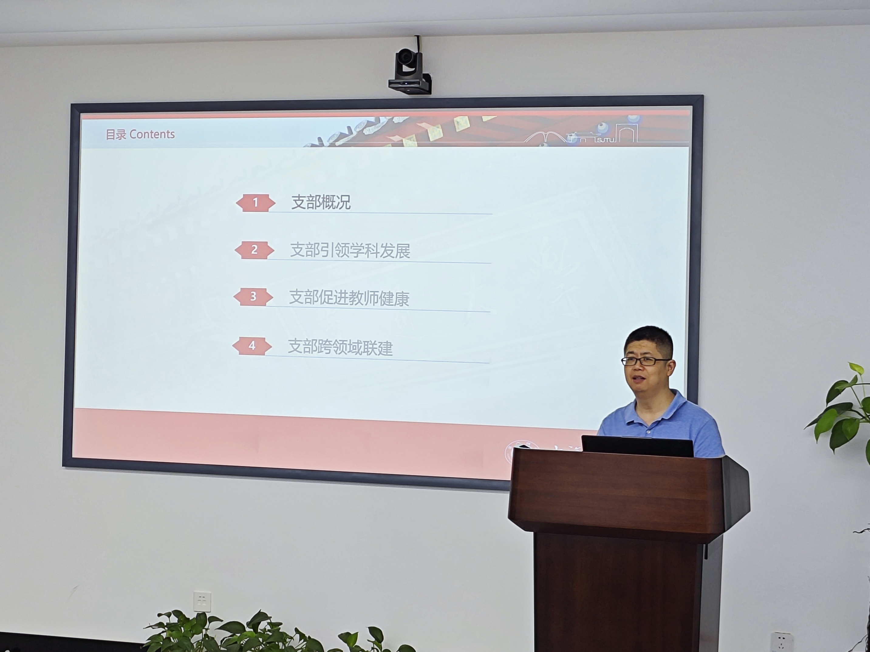 詹路作环境工程第二党支部党建工作介绍,他分享了支部在强化理论武装、聚焦主责主业、推动教学科研深度融合等方面的特色做法与成效。