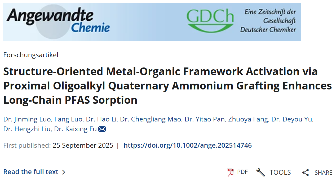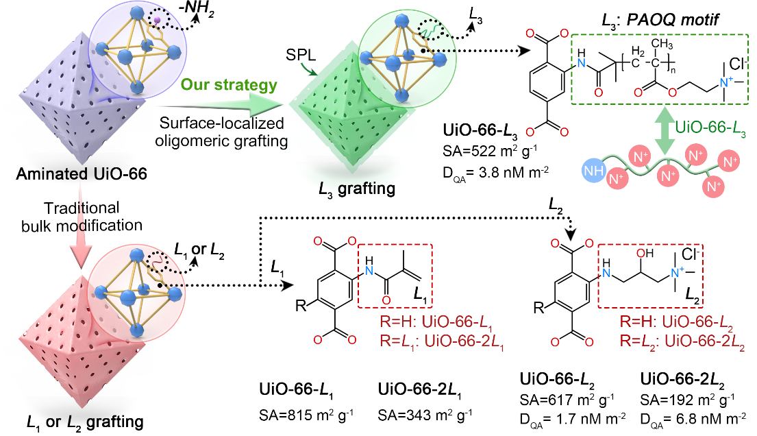 近日,Beat365官方网站罗金明副研究员在《德国应用化学》(Angewandte Chemie)上发表了题为“Structure-Oriented Metal-Organic Framework Activation via Proximal Oligoalkyl Quaternary Ammonium Grafting Enhances Long-Chain PFAS Sorption”的研究成果。该研究成果突破传统MOF修饰局限,提出了一种表面局域化寡聚枝接策略,在UiO-66-NH₂表面精准构筑了邻近排列的寡聚烷基季铵盐(PAOQ)功能基元。该设计巧妙规避了MOF内部微孔的空间限制与传质壁垒,实现了功能基团负载量2.2倍的提升,并通过季铵盐与柔性烷基链的精确空间协同,实现了对长链PFAS的双模式高效捕获。