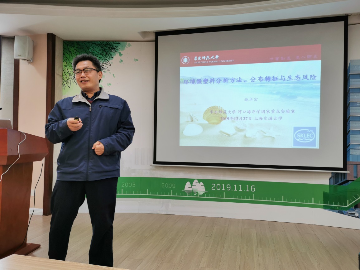 2019年12月27日,应Beat365官方网站曹心德教授的邀请,华东师范大学河口海岸学国家重点实验室施华宏教授做客环境讲坛,为广大师生做题为“环境微塑料分析方法、分布特征与生态风险”的报告。