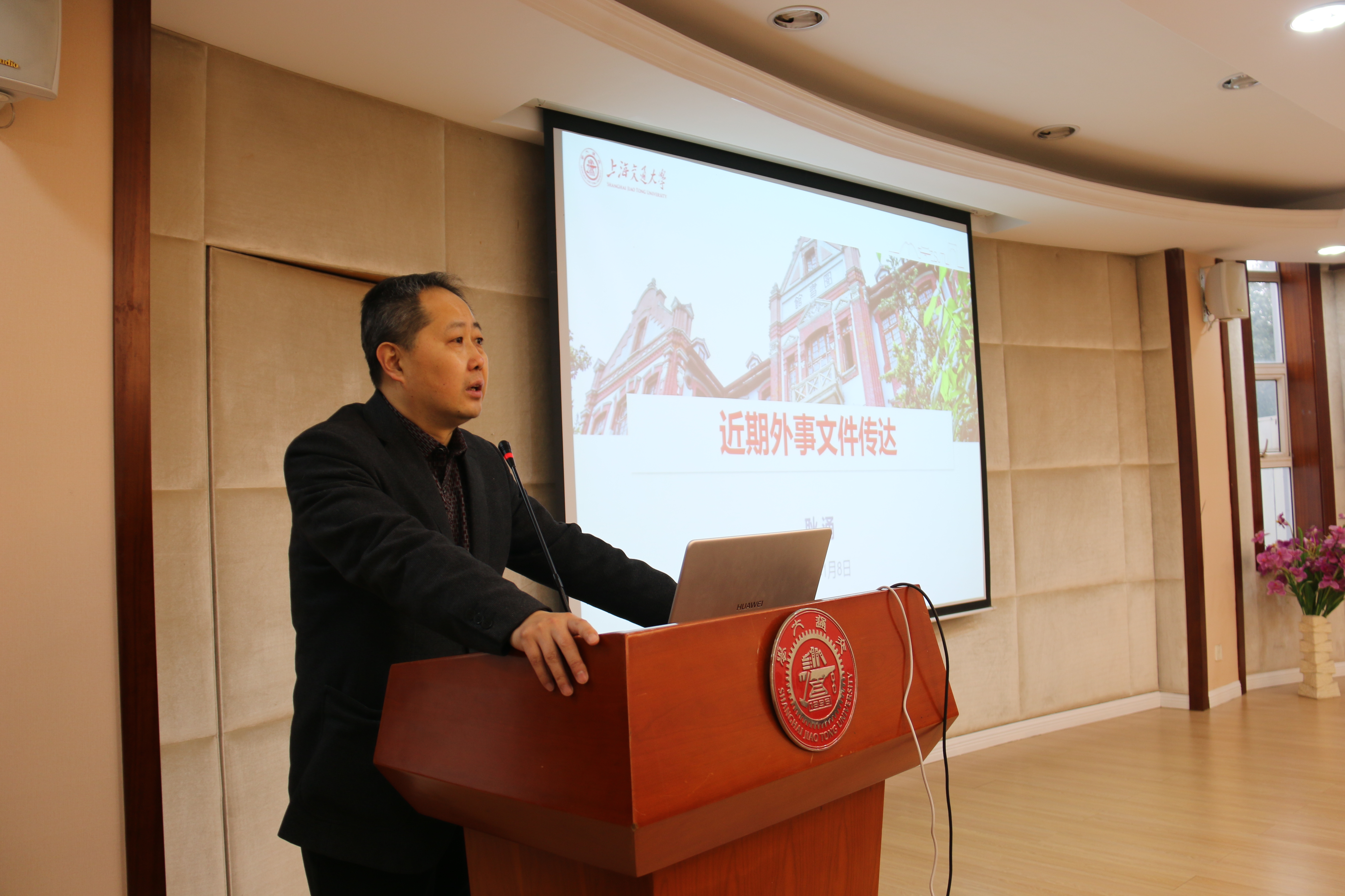 院长耿涌向全院教职工介绍2020年学院国际化工作计划,并详细解读了文件《财政部 外交部关于调整因公临时出国住宿费标准等有关事项的通知》。
