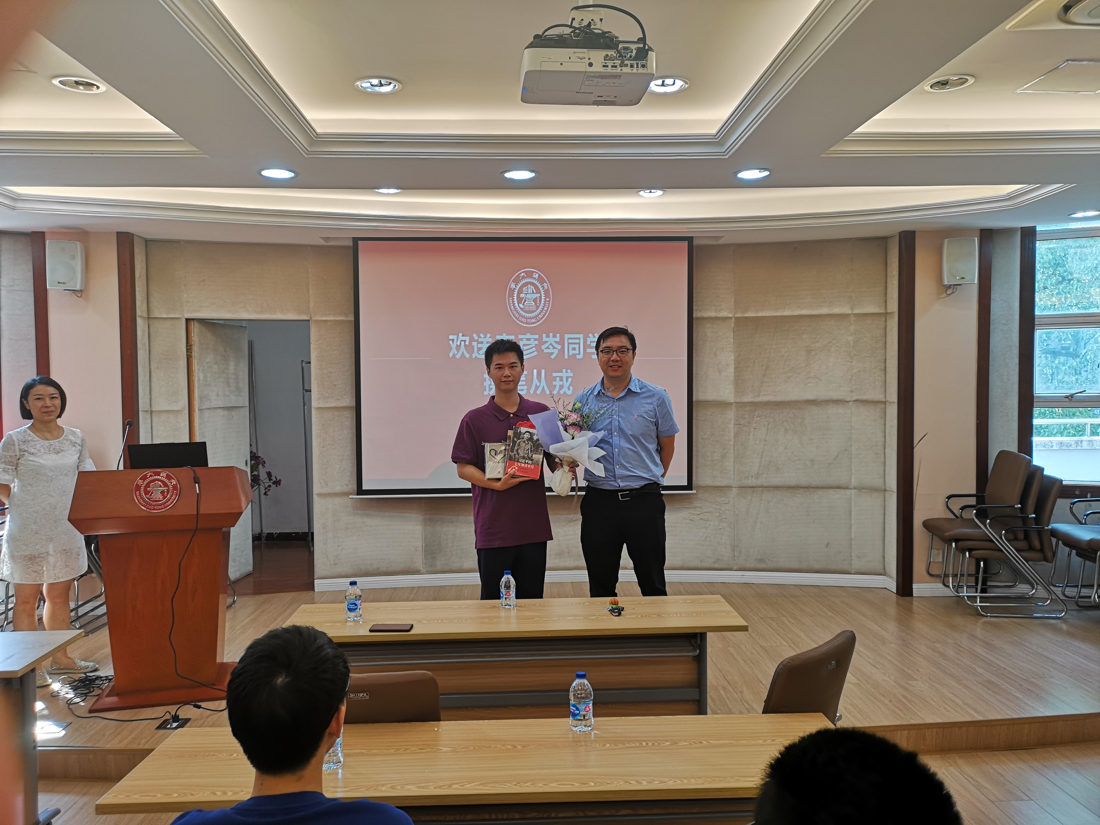 欢送会一开始,主持人于爱涛老师为大家介绍了韦彦岑同学的个人情况,并代表学院表达了对新兵战士的真挚祝福。
