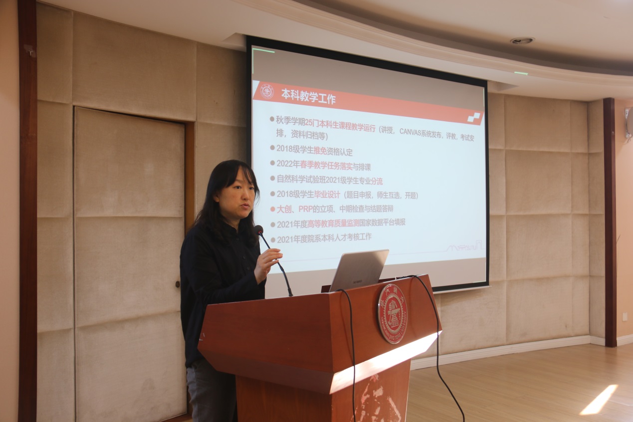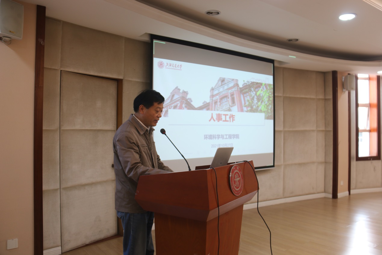 胡薇薇向与会教职工传达学校十一届四次全委会报告精神及2021年秋季干部大会报告精神,并对2021年下半年学院重点工作进行部署。胡薇薇指出,十三五期间,学院在立德树人、师资队伍、基地平台等多个方面实现突破,为学科发展打下了坚实基础。2021年是“十四五”开局之年,站在深入打好污染防治攻坚战和“碳达峰碳中和”战略的历史起点上,学院全体教职工都应继承和发扬优良传统,保持同心同力、实干兴邦的干劲和担当作为、改革创新的姿态,紧密对接国家战略,形成学科特色优势,把立德树人作为第一要务,把创新策源作为重要使命,全力推进学院各项事业再上新台阶,为美丽中国建设、人与自然和谐发展做出新的更大贡献。