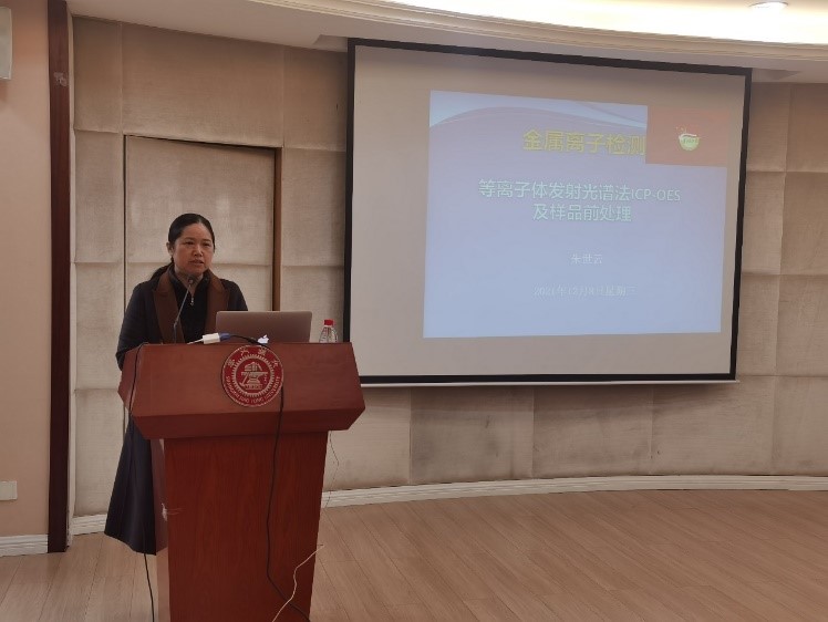 12月8日上午特邀学院分析测试中心朱世云副教授为主讲嘉宾,重点围绕金属离子检测开展了培训活动,21级硕士党支部及本科生党支部12名同学在学院二楼报告厅加了本次培训。