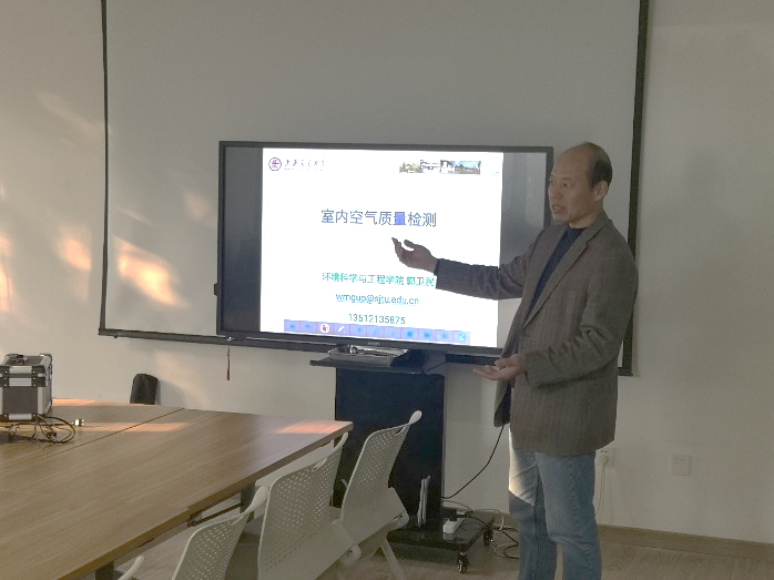 12月10日上午特邀学院分析测试中心郭卫民副教授为主讲嘉宾,重点围绕如何开展空气质量检测的培训。郭卫民以甲醛和TVOC作为重点检测对象,从室内甲醛和TVOC的来源和危害、室内空气标准和相应的检测方法三个方面在威达楼205会议室对50名学生志愿者们展开了培训。