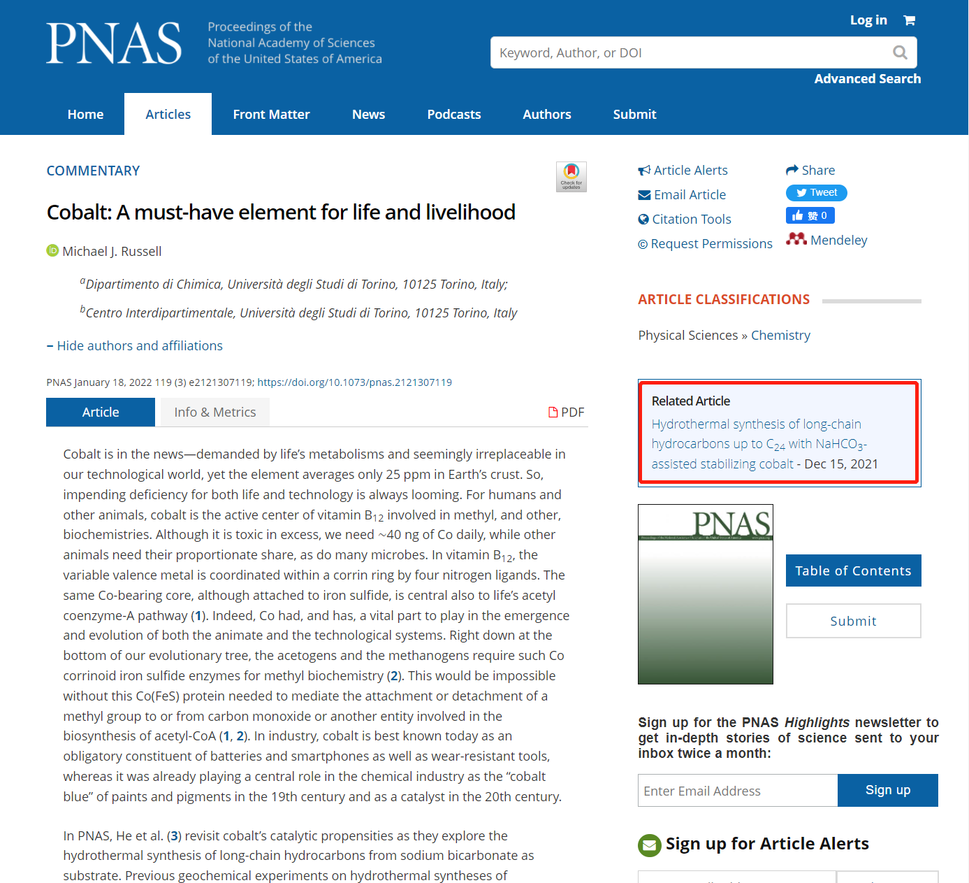上月,Beat365官方网站金放鸣教授研究团队在《美国科学院院刊》(Proceedings of the National Academy of Sciences of the United States of America,PNAS)发表了水热转化二氧化碳产长链烷烃的论文,并被PNAS选为热点评述文章。近日,国际著名的海底生命起源学说创始人Michael J. Russell教授在PNAS对该研究发表了题为“Cobalt: A must-have element for life and livelihood”的重要专评文章(https://doi.org/10.1073/pnas.2121307119)。