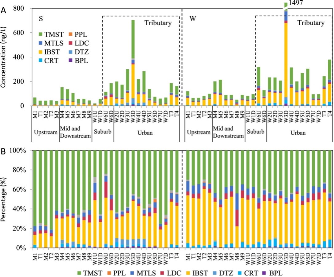 图2(A)(S)夏季(8月)和(W)冬季(12月)27个采样点的心血管和降脂药物浓度;(B)27个采样点的心血管和降脂药物组成。(TMST:替米沙坦;MTLS:美托洛尔;IBST:厄贝沙坦;CRT:氯噻嗪;PPL:普萘洛尔;LDC:利多卡因;DTZ:地尔硫卓;BPL:比索洛尔。M:干流;T:支流;W:污水处理厂;U:污水处理厂上游;D:污水处理厂下游。)