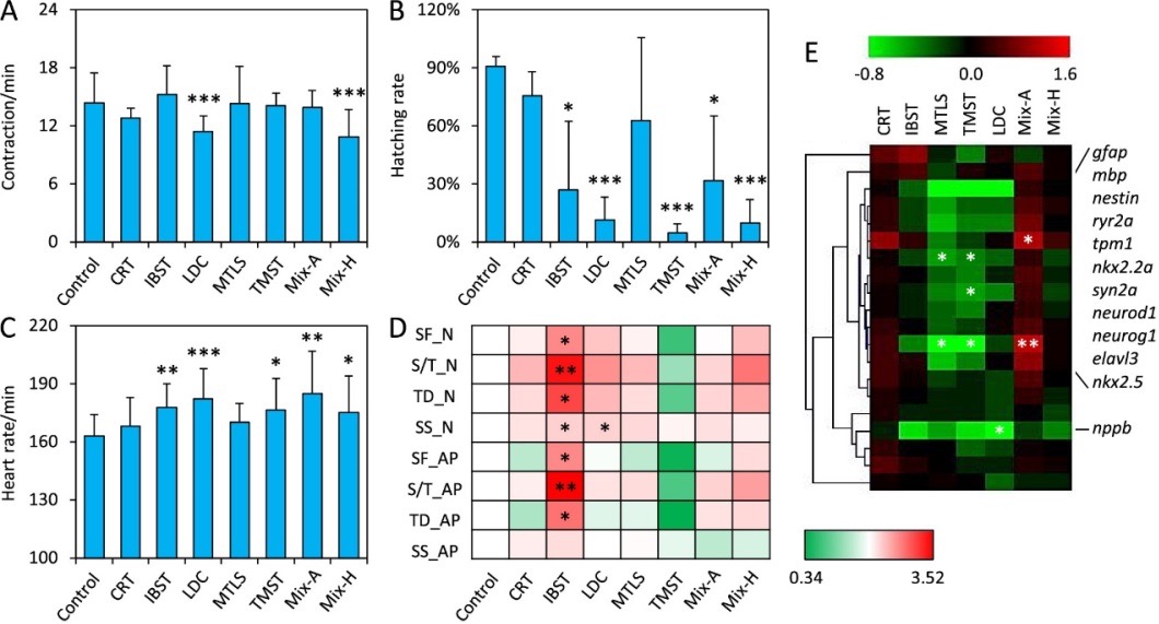 如图5所示,24hpf斑马鱼胚胎在LDC和混合物(Mix-H)下,自发收缩频率显着降低,分别降低了20.5%和24.2%。IBST、LDC、TMST和两种混合物(Mix-A和Mix-H)暴露组中,胚胎的孵化率也有所下降(图5B)。IBST、LDC、TMST和两种混合物(Mix-A和Mix-H)造成心率显著增加。其中,LDC(增加11.8%)和Mix-A(增加13.5%)效果最明显。此外,在一般运动和短期光刺激后,IST暴露后96hpf胚胎游泳行为显着增加(图5D)。分子水平上,聚类分析表明MTLS、TMST和LDC暴露后大多数基因下调。其中,nppb作为一种在心血管稳态中起重要作用的心钠素,在MTLS、TMST和LDC暴露后分别显着下调1.5、1.7和1.8倍。目前,一些典型心血管和降脂药物,如利多卡因和替米沙坦,已被证明可以改变胚胎的早期发育,导致心功能和神经行为学损伤。因此,当前研究结果扩展了我们对其环境浓度下生态毒性效应的认识。