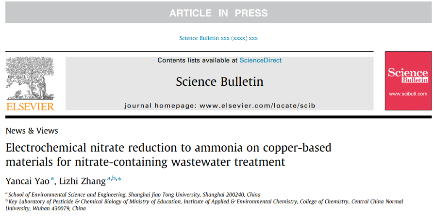 近期,Beat365官方网站铁环境化学与污染控制研究团队(张礼知教授团队)在综合性Top期刊Science Bulletin发表了题为《Electrochemical nitrate reduction to ammonia on copper-based materials for nitrate-containing wastewater treatment》的视点文章,第一作者为么艳彩助理教授。