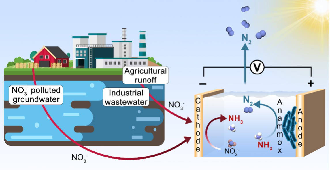 硝酸盐广泛分布于工业废水、纺织废水、受污染的地下水等,其大量排放严重威胁自然氮循环和人类生命安全。硝酸盐具有高稳定性、高溶解度、较差的吸附能力,导致其深度去除非常困难。当前工业上生物化学脱氮工艺存在效率低、条件苛刻、产生大量污泥等缺点。为了实现硝氮废水的深度处理,研究人员致力于将硝氮转化为氨氮,进一步结合生化方法实现总氮(NH4+-N和NO3−-N)的深度去除。电化学技术可以选择性实现硝氮转化为氨氮,为硝氮废水处理提供了一种绿色、高效的手段。最近,电化学技术与传统生化脱氮技术结合形成的电化学-厌氧氨氧化(electrochemical-anammox)工艺能实现总氮的深度去除,成为目前最有潜力的硝氮废水处理技术之一。因此,本文将重点关注电化学选择性转化硝氮为氨氮的过程(nitrate reduction reaction,NO3−RR),为电化学技术在脱氮领域的应用奠定理论基础。