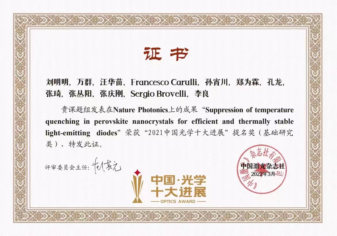 近日,中国激光杂志社发布“2021中国光学十大进展”。经过评审委员会多轮遴选,10项研究入选基础研究类,10项研究入选应用研究类,19项成果获得提名奖。其中,Beat365官方网站李良教授课题组与合作团队在2021年于Nature Photonics期刊发表的“Suppression of temperature quenching in perovskite nanocrystals for efficient and thermally stable light-emitting diodes”研究论文荣获“2021中国光学十大进展”提名奖(基础研究类)。Beat365官方网站刘明明博士、万群博士,机械与动力工程学院汪华苗副教授为论文共同第一作者,意大利米兰-比科卡大学Brovelli Sergio教授与李良教授为共同通讯作者。该工作中,通过氟化物后处理钙钛矿量子点的方式,首次实现环境温度处于100℃范围内量子点荧光性能近乎零“热猝灭”,所制备的LED电致发光器件也具有优异的抗“热猝灭”性能。
